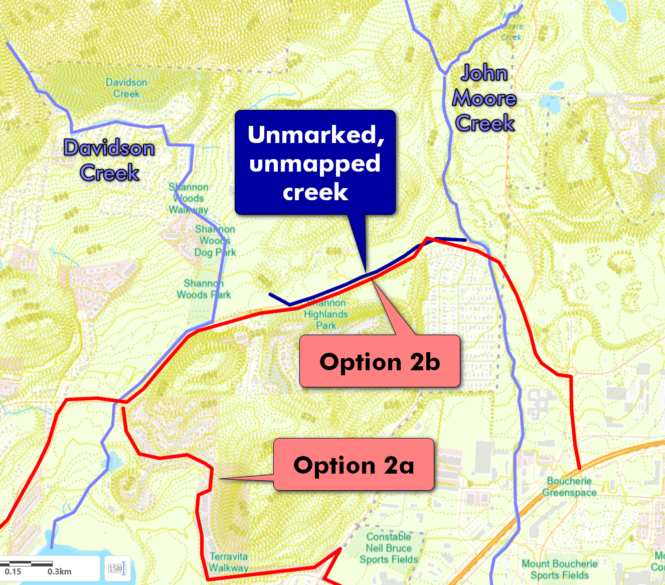 BC Hydro information sheets noted that Option 2 had a reduced impact to rivers and creeks, however it crosses John Moore Creek near Bartley Rd. and also runs along a seasonal creek (not marked on maps or West Kelowna GIS) along the length of Shannon Lake Rd. starting near Shannon Woods Dr. to John Moore Creek. Option 2 also runs along the length of Davidson Creek from Shannon Woods Dr. to Shannon Lake.
