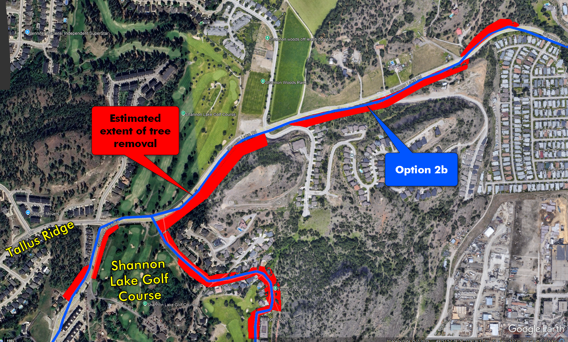 Both options 2A and 2B impact the Shannon Lake Rd. from the golf course to the BC Hydro substation.